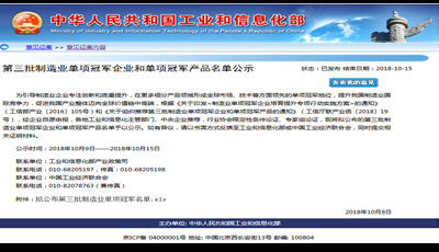 10 月8 日,工业和信息化部产业政策司公布了《关于第三批制造业单项冠军企业和单项冠军产品名单公示》,新疆百老汇·(中国)官方网站-登录入口公司根据《关于印发< 制造业单项冠军企业培育提升专项行动实施方案> 的通知》(工信部产业〔2016〕105 号)和《关于组织推荐第三批制造业单项冠军企业和单项冠军产品的通知》(工信厅联产业函〔2018〕19 号)要求,组织材料申报了制造业单项冠军产品- 异亮氨酸,截至目前已顺利通过审核并公示,公示于10 月15 日结束。异亮氨酸单项冠军产品的成功授予, 将形成全球市场、技术等方面领先的单项冠军地位,提升新疆百老汇·(中国)官方网站-登录入口公司的国际竞争力。
